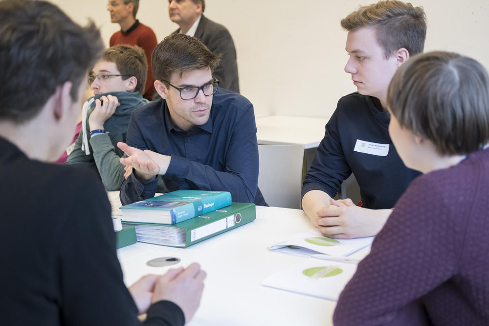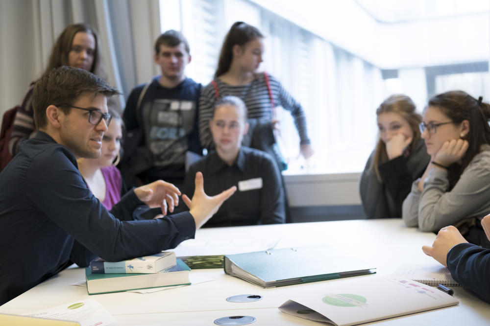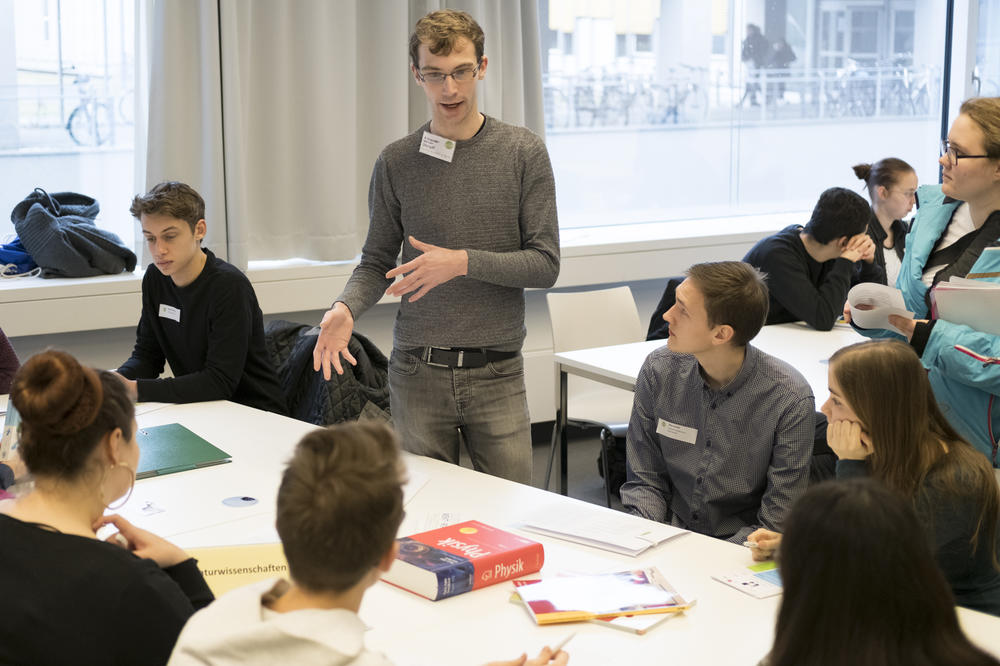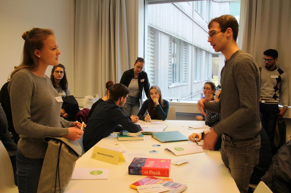 Für einen tieferen Einblick kamen die Schülerinnen und Schüler an Thementischen mit Tutorinnen und Tutoren der Fächer ins Gespräch und erfuhren so etwas über den Unialltag.